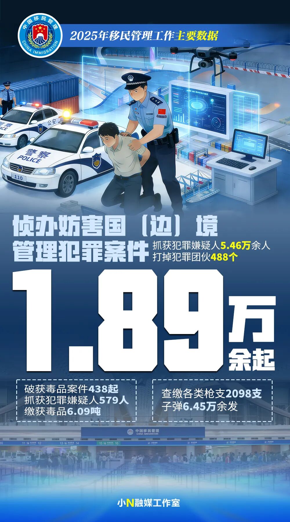 2025年1月8日,江苏边检总站太仓边检站优化船舶出入境流程,保障载有数千辆国产汽车的货轮高效通关。 2025年,全国移民管理机构围绕服务促进经济稳定增长,更好保障“引进来”“走出去”,持续深化移民管理服务改革和政策制度创新,不断提升移民管理服务效能,全年签发普通护照2089.7万本、内地(大陆)居民往来港澳台证件签注9853.8万张(件)次,签发港澳台居民来往内地(大陆)通行证225.4万张,签发外国人签证证件202万证次。国家移民管理局政务服务平台为中外出入境人员提供查询等政务服务1.85亿人次,为港澳台居民、海外华侨和永久居留外国人免费提供身份认证服务7632.9万人次;国家移民管理机构12367服务平台受理中外人员各类咨询等711万人次,平均满意率达99.5%。 2025年6月12日,广西边检总站、广西壮族自治区公安厅出入境管理总队联合开展出入境政策宣介活动。 围绕促进中外人员交流交往,扩大内地居民换发补发出入境证件“全程网办”试点城市范围,总数增至50个;增加印度尼西亚为240小时过境免签政策适用国家、广东5个口岸为政策适用口岸,口岸总数增至65个;实施东盟国家旅游团入境云南西双版纳免签政策;配合有关部门将我国单方面免签国家增加至48国、互免签证国家扩大至29国,推动对中国单方面免签国家增至28国。 2025年2月18日,享受东盟国家旅游团入境云南西双版纳免签政策的旅行团从磨憨公路口岸入境。 围绕服务内地(大陆)与港澳台地区人员往来,扩大往来港澳人才签注政策实施范围至长三角、京津冀以及全国所有自由贸易实验区;为持探亲签注往来港澳地区的内地居民在港澳地区续办同类型探亲签注提供便利;在珠海、横琴粤澳深度合作区实施赴澳门旅游“一周一行”“一签多行”政策;为有需求的港澳台居民提供来往内地(大陆)通行证与居住证“双证关联”核验服务;实施减免台湾“首来族”办理台胞证证件费政策;增加天津港等42个口岸为台胞办理一次有效来往大陆通行证,台湾居民在大陆办理一次有效来往大陆通行证的口岸增至100个;出台大陆居民申办往来台湾探亲签注“全国通办”政策。 围绕服务促进国家和区域发展战略,实施支持中国—上海合作组织地方经贸合作示范区、上海东方枢纽国际商务合作区、广州白云机场国际商务合作区、河套深港科技创新合作区等建设发展的一批移民出入境管理新政,助力打造对外开放新高地;创新实施更加积极开放有效的引才引智政策制度,推动构建入境签证、停留居留、永久居留、融入服务等全流程响应的制度体系。 2025年4月9日,福建厦门,“中国—金砖国家新时代科创孵化园”移民事务服务站工作人员为外籍人员办理业务。 围绕推进边检通关便利化,扩大24小时直接过境免办查验手续适用口岸;在全国旅检口岸统一实施过境免签临时入境许可受理签发和入境边检手续一次办结;在上海市试点推行电子口岸签证;推行外国人入境卡网上填报;推广应用“刷脸”智能通关;在云南河口、磨憨口岸以及内蒙古甘其毛都口岸试点建设车辆快捷通关系统;支持二连浩特等公路口岸货运通道试行7×24小时通关。 2025年8月5日,云南边检总站移民管理警察开展实战演练。 2025年,全国移民管理机构统筹推进严厉打击妨害国(边)境管理犯罪,持续深化“三非”外国人治理,侦办妨害国(边)境管理犯罪案件1.89万余起,抓获犯罪嫌疑人5.46万余人,打掉犯罪团伙488个,挂牌督办重特大案件229起。严厉打击口岸边境涉枪爆、贩毒走私等违法犯罪,破获毒品案件438起,抓获犯罪嫌疑人579人,缴获各类毒品6.09吨,破获万克以上案件74起;查缴各类枪支2098支,子弹6.45万余发。 2025年1月10日,西藏定日6.8级地震受灾群众向在震中救援的西藏日喀则边境管理支队移民管理警察献上哈达并表示感谢。 2025年,全国移民管理机构共有120余个集体、260余名个人荣获省部级以上荣誉或二等功以上奖励,其中1个集体被授予“公安楷模”称号、3名个人荣获“全国先进工作者”。共有9名民警牺牲殉职,76名民辅警因公负伤,用鲜血和生命践行了“人民公安为人民”的庄严承诺。 2025年3月7日,新疆喀什排依克边境派出所移民管理警察在边境地区巡逻踏查。